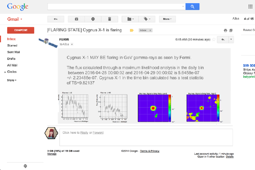 Actually, it’s just an email. And it’s not even from a real person. It’s an automatic mail. But for me, it’s a big surprise. It’s from the Fermi team. They’ve sent me an alert. Do you remember why they might be doing that? Cyg-X1 has woken up !!!