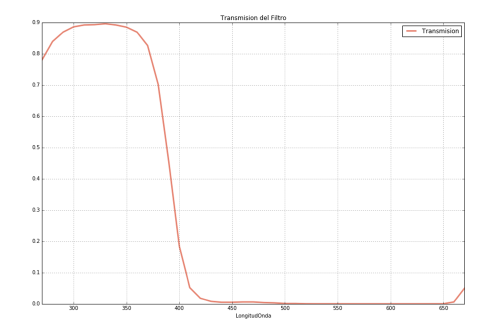 La luz que nos llega de los gamma aumenta muy rápido con la longitude de onda entre 250 y 350 nanómetros, pero después, al contrario de la que nos llega de la luna, disminuye para longitudes de onda mayores. Por eso escogimos un filtro que tuviera una buena transmisión por debajo de 350 nanómetros y que no dejara pasar luz por encima de 400 nanómetros.
