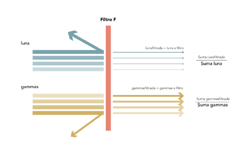El filtro absorbe más o menos luz dependiendo de la longitud de onda. Y tanto la luz que viene de la Luna como de los gammas tiene intensidades diferentes también en función de la longitud de onda. Así que tenemos que mirar cuánta luz de los gammas pasa y cuánta de la Luna se absorbe para cada longitud de onda. Para saber el total sumamos todos los valores.